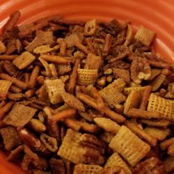A mix of 3 types of chex, pretzels, and peacans covered in a brown sugar glaze that is impossible to stop eating. (In close company we call this "Christmas Crack".)